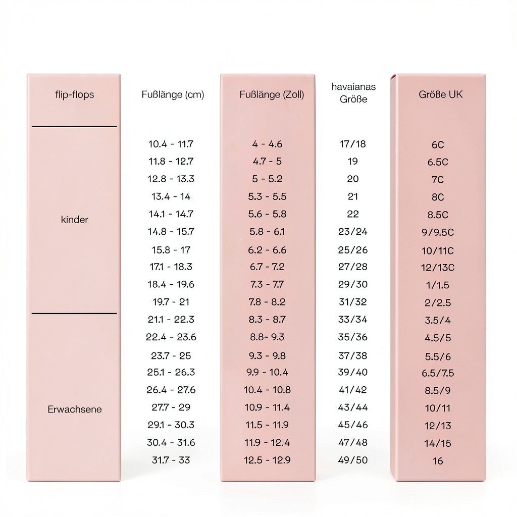Die Flip-Flops sind in den Größen 33/34 EU bis 42 EU erhältlich, darunter auch Halbgrößen wie 35/36 EU oder 39/40 EU, um eine passgenaue Auswahl zu ermöglichen.